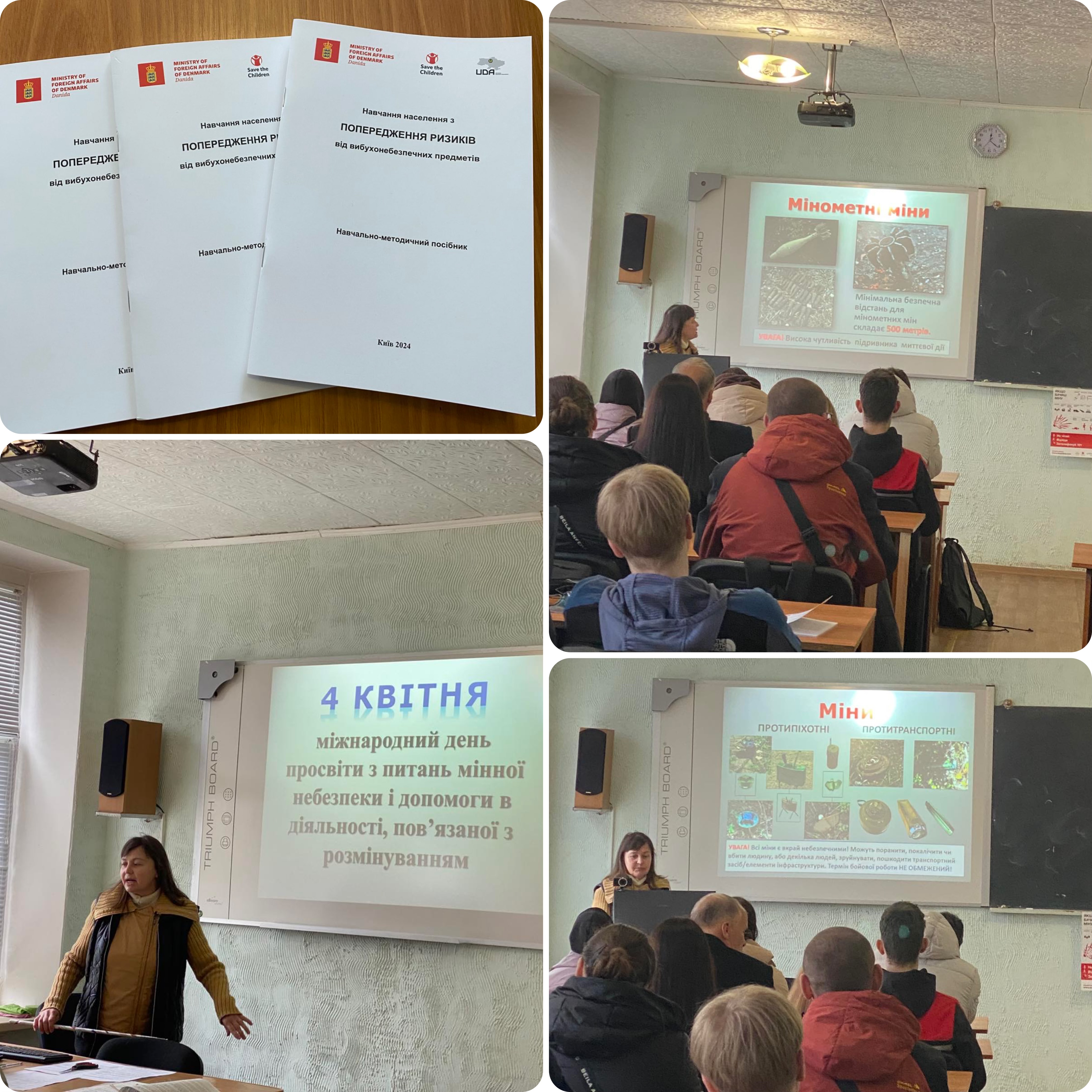 02 квітня у коледжі для здобувачів освіти І та ІІ курсів викладачем дисципліни БЖД, інструктором з попоредження ризиків, повʼязаних з вибухонебезпечними предметами Богомол Іриною та практичним психологом Неділько Ольгою була проведена виховна година присвячена міжнародному дню просвіти з питань мінної безпеки.