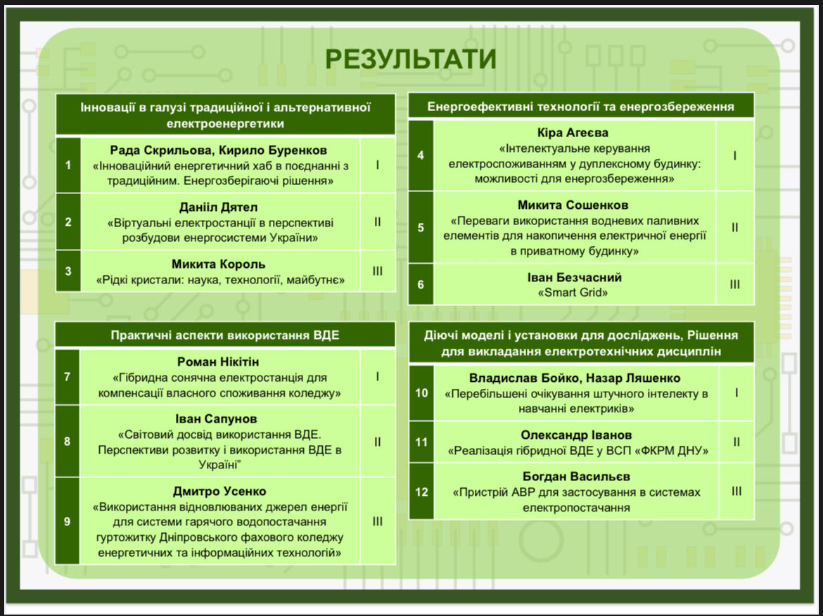 24.04.25 р. відбувся «Конкурс-захист науково-дослідницьких робіт з електротехнічних дисциплін серед студентів закладів фахової передвищої освіти Дніпропетровської області». Вітаємо студента 4 курсу групи ЕТ-21-9-д Безчасного Івана та керівника Дудченко Ю. В. з 3 місцем у номінації «Енергоефективні технології та енергозбереження». Представлена науково-дослідницькa робота на тему "Smart Grid" є актуальною під час повоєнного відновлення енергопостачання.