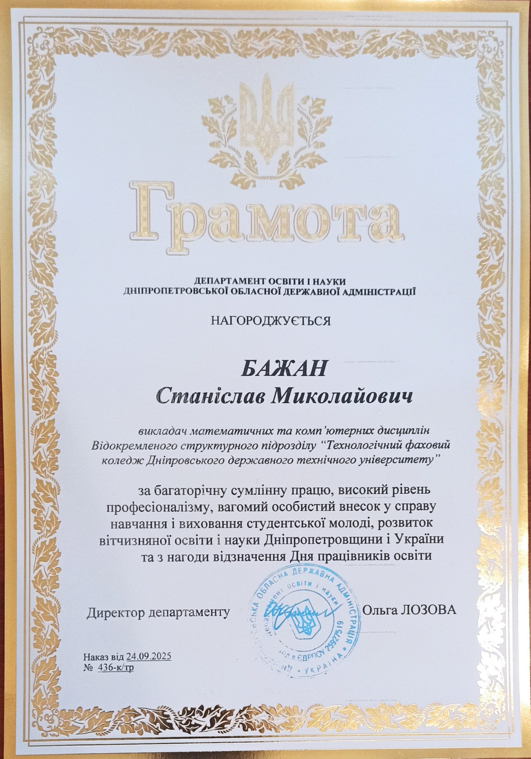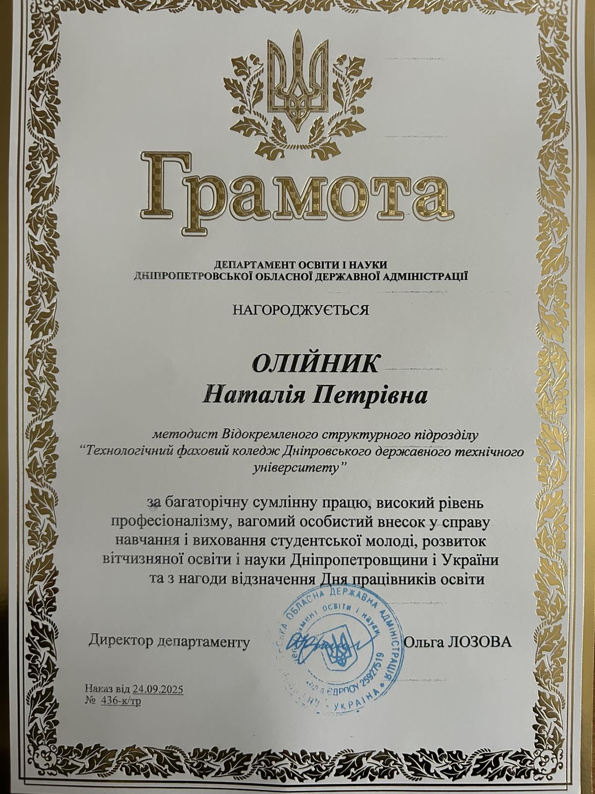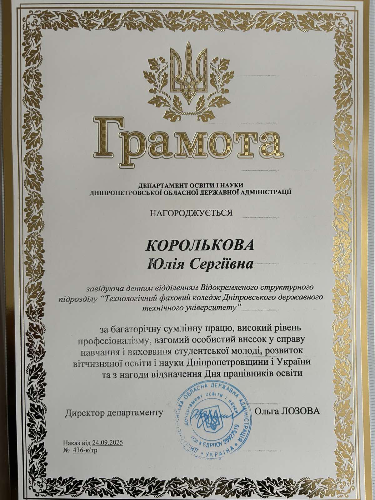 З нагоди Дня працівників освіти педагоги ВСП «Технологічний фаховий коледж ДДТУ» отримали відзнаки Департаменту освіти і науки Дніпропетровської обласної адміністрації, Державної установи «Науково-методичний центр вищої та фахової передвищої освіти».