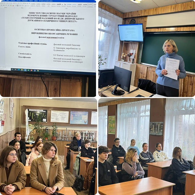 Освітньо-професійну програму “Виробництво неорганічних речовин” (галузь знань G Інженерія, виробництво та будівництво, спеціальність G1 Хімічні технології та інженерія). Програму представила Тетяна Бутенко, викладач циклової комісії фармації і хімічних технологій, голова робочої групи.