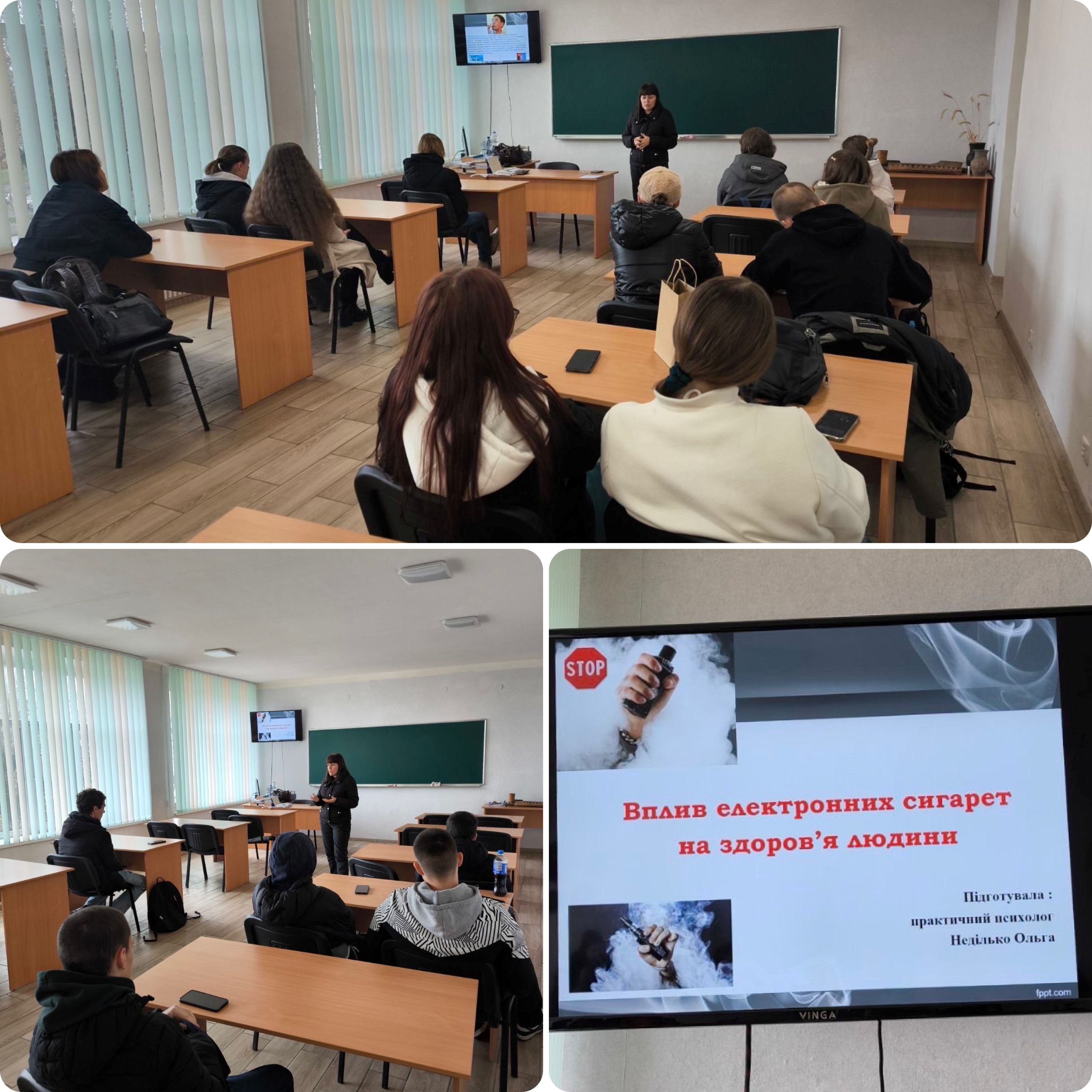 14 листопада до Міжнародного дня не паління, який відзначають у третій четвер листопада у нашому коледжі був проведений практичним психологом Неділько О.В. просвітницько-профілактичний захід «Безпечного паління не існує. Шкода паління електронних сигарет», де здобувачі освіти дізналися про наслідки вживання електронних сигарет, які є не менш шкідливими за звичайні сигарети.