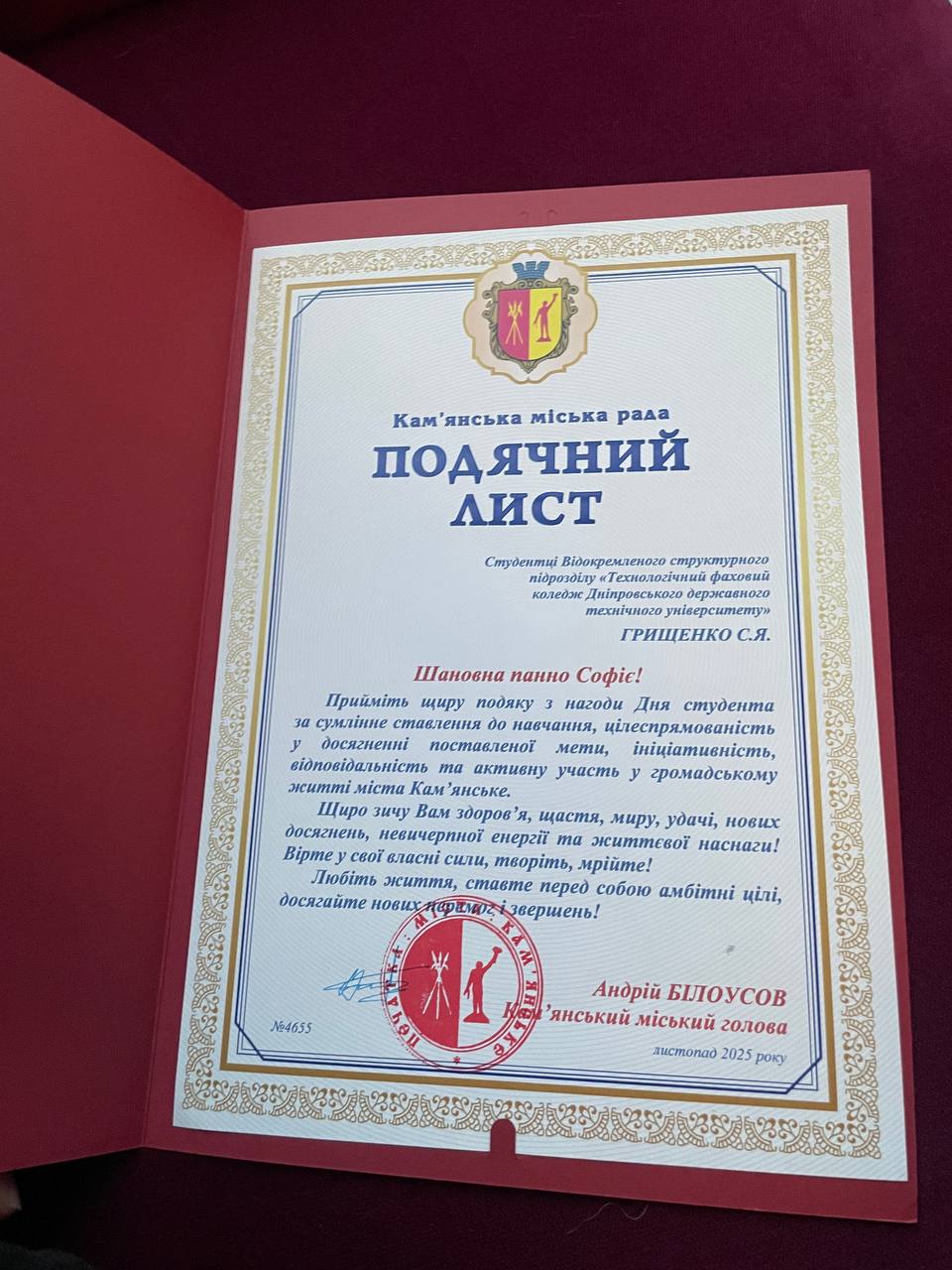14.11.2025 р. мер нашого міста з гордістю нагородив кращих студентів нашої громади напередодні Міжнародного дня студента, серед яких була й наша студентка — Грищенко Софія, голова спортивного сектору студентського парламенту коледжу.  Цей важливий момент став справжнім визнанням її старань, наполегливості та прагнення розвиватись.
