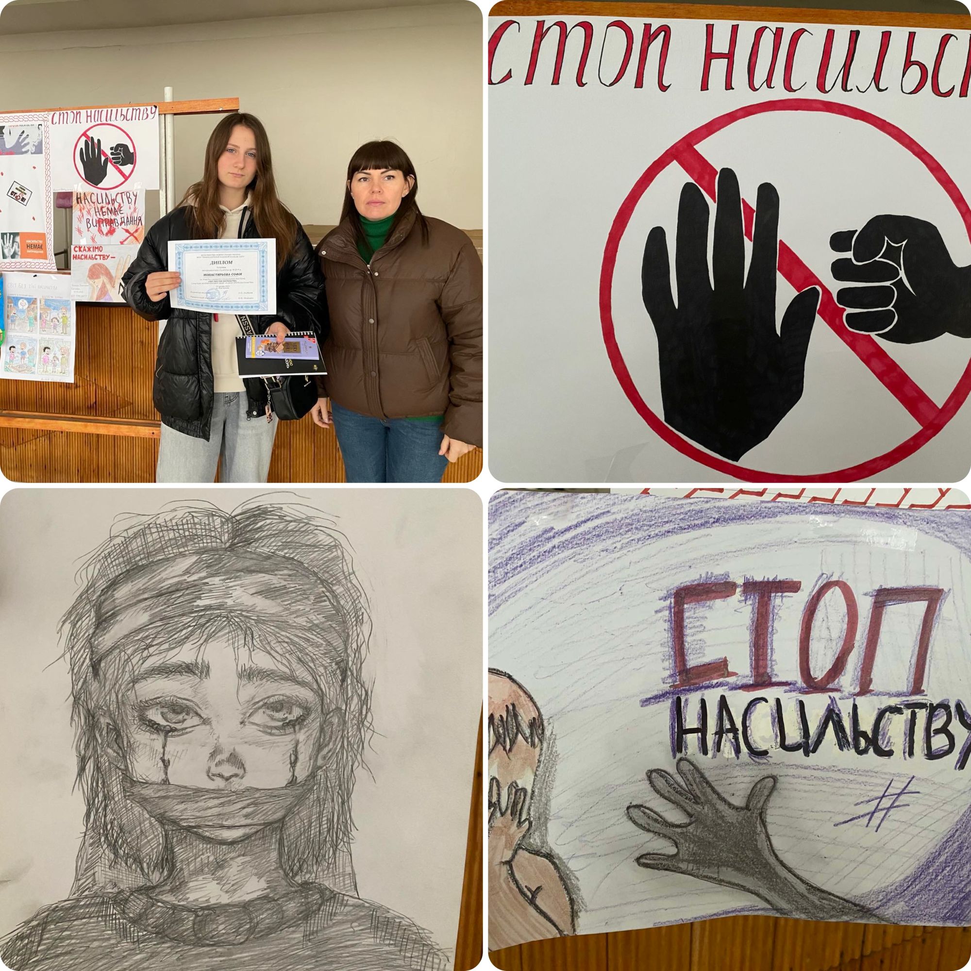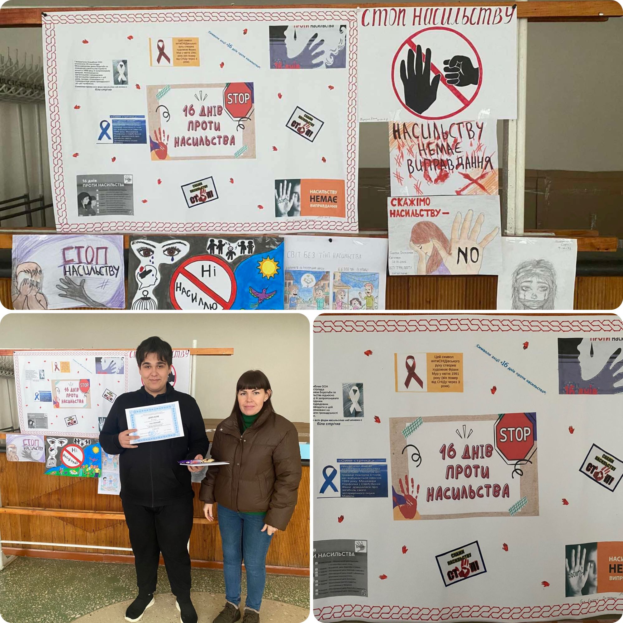 До щорічної Всеукраїнської акції «16 днів проти насильства» (з 25.11-10.12) у нашому коледжі відбулася акція, в якій здобувачі освіти взяли участь та розкрили тему протидії насиллю через творчі роботи у вигляді стінгазет та соціальних постерів «Світ без тіні насильства», що є актуальним у нашому сьогоденні. Усі учасники отримали від практичного психолога коледжу дипломи та, за підтримки профспілки, призи та додаткові бали до рейтингу на стипендію. |
