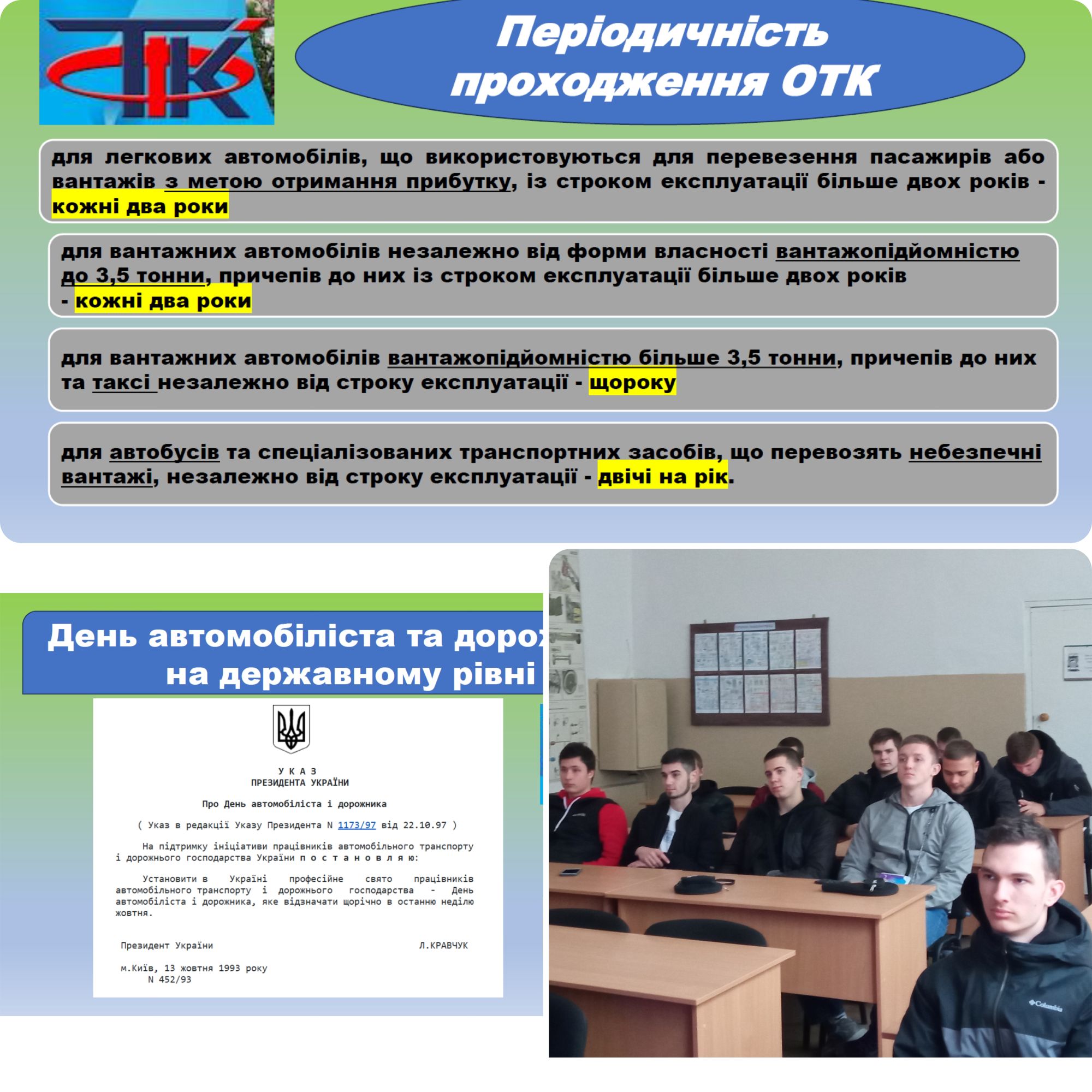 - щорічно в останню неділю жовтня (починаючи з 1993 р.); - транспортні засоби, які підлягають ОТК; - перелік технологічного обладнання, необхідного для проведення ОТК. - виконавців ОТК, в тому числі розташованих у м. Кам҆҆янське та околицях. Здобувачам освіти було цікаво, відчувався діалог між ведучим та аудиторією. В подальшому, даний матеріал буде використано для навчання студентів-автомобілістів при вивченні дисципліни «Вступ до спеціальності».