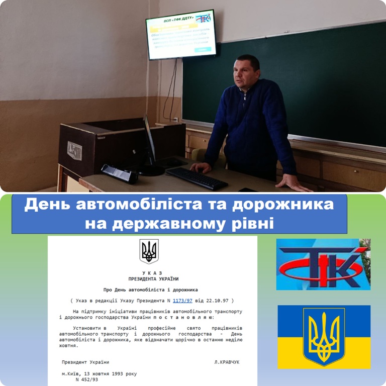 У межах виховної роботи у ВСП «ТФК ДДТУ» для здобувачів освіти спеціальності J8 «Автомобільний транспорт» циклової комісії «Автомобільного транспорту, галузевого машинобудування та будівництва» 23 жовтня 2025 р. було проведено захід, присвячений до Дня автомобіліста та дорожника: «Обов’язковий технічний контроль колісних транспортних засобів – запорука безпеки комерційного транспорту на дорогах України». Захід був спрямований для виховання у молоді традиції святкування професійного свята «День автомобіліста та дорожника» та направлений на знання процедури проведення обов’язкового технічного контролю (ОТК) колісних транспортних засобів для зменшення аварійності на дорогах з причин технічних несправностей КТЗ. Мета заходу - ознайомлення з порядком проведення обов’язкового технічного контролю та обсягами перевірки технічного стану транспортних засобів. Захід проводив викладач спецдисциплін Ігор ПІДДУБНИЙ. Під час зустрічі здобувачі освіти дізналися про: - запровадження на державному рівні відзначення Дня автомобіліста та дорожника
