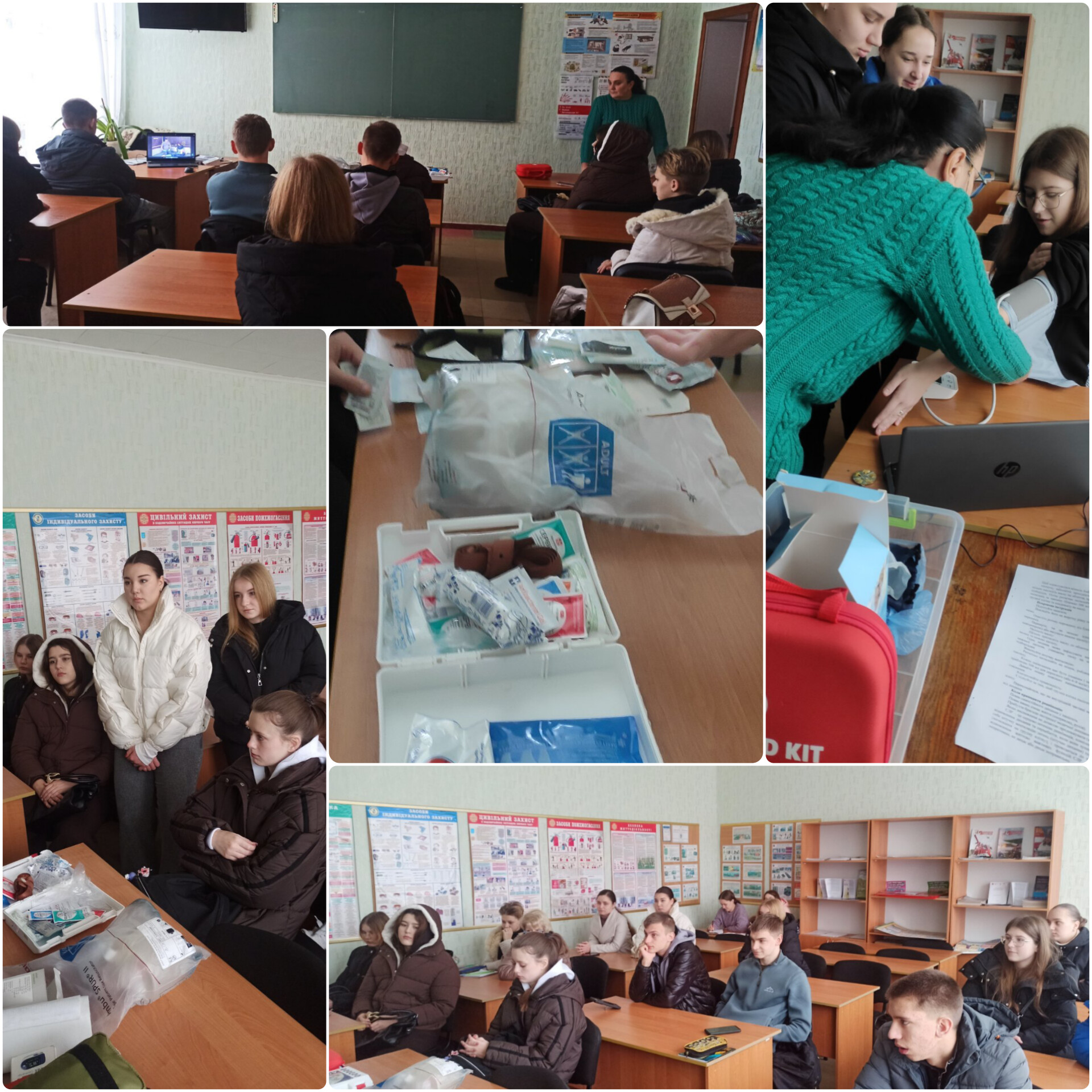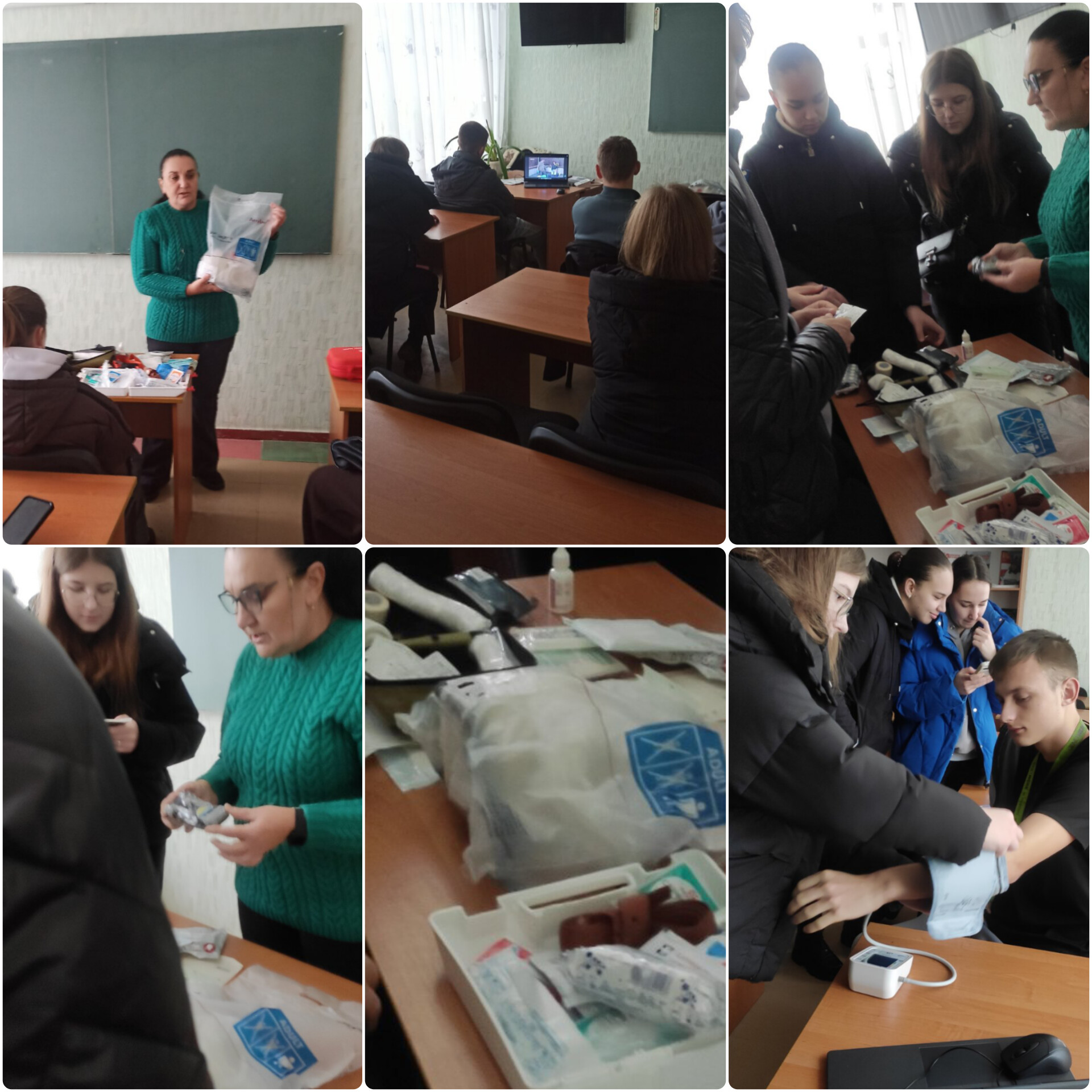 Під час заходу здобувачі освіти ознайомилися з різними типами аптечок та їхнім вмістом, розглянули алгоритми першочергових дій у надзвичайних ситуаціях, а також практично відпрацювали навички накладання турнікету, використання апарату штучної вентиляції легень та інше.