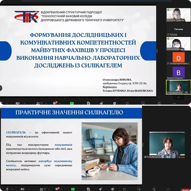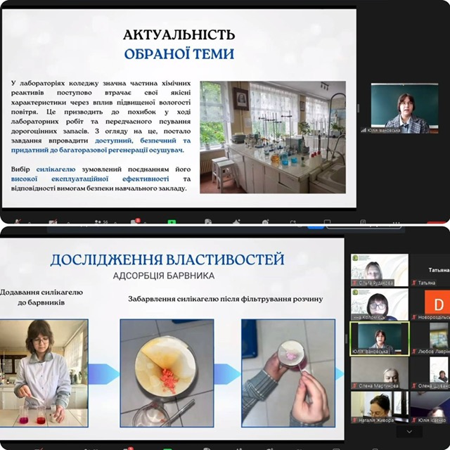 Під керівництвом Т. В. Бутенко та Ю. В. Івановської здобувачка дослідила властивості силікагелю, практичне значення та спосіб його одержання в лабораторії коледжу. За результатами роботи були опубліковані тези дослідження у збірнику матеріалів конференції, а сама Олександра успішно провела захист своєї презентації в онлайн-форматі, продемонструвавши високий рівень підготовки та науковий потенціал.