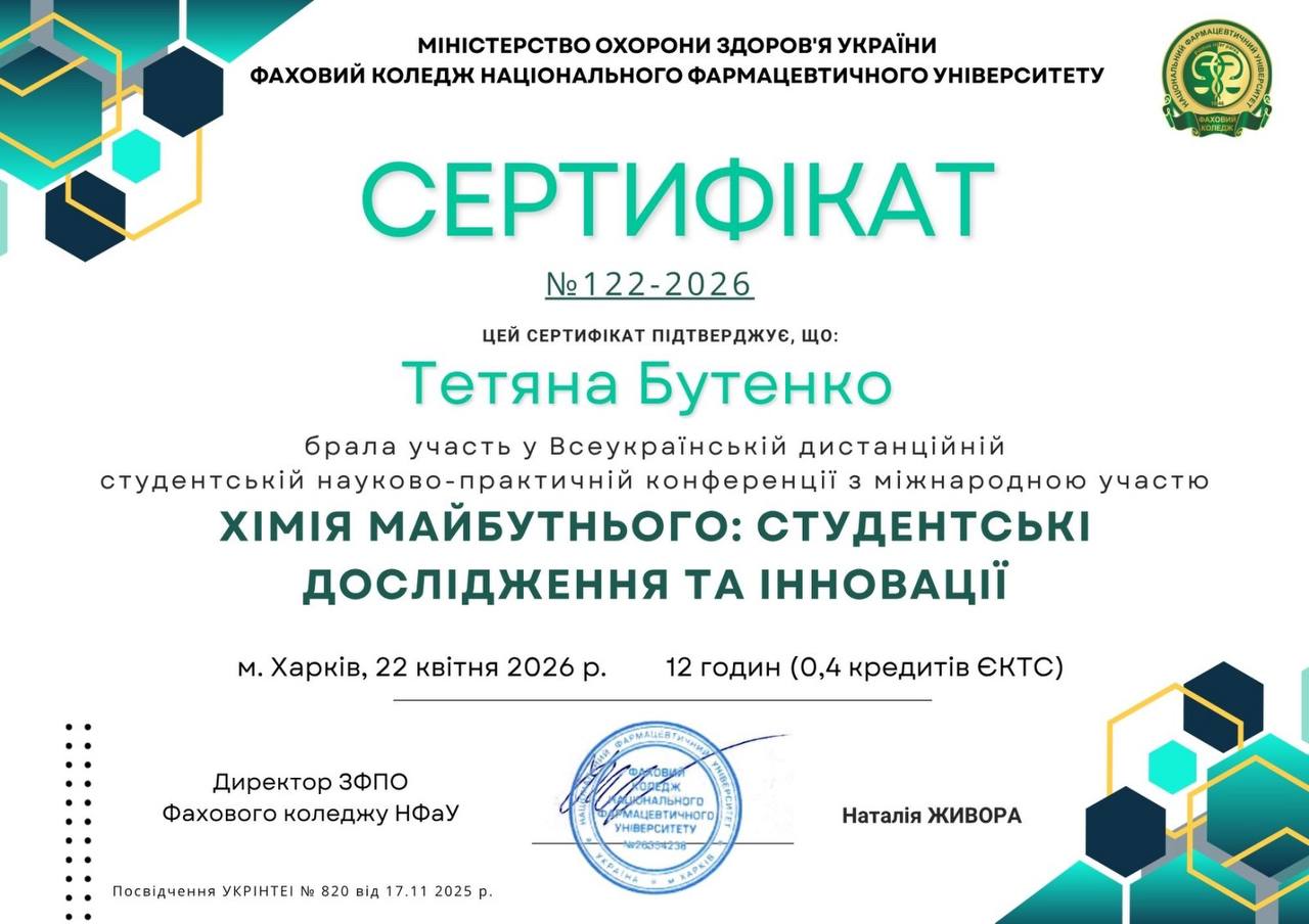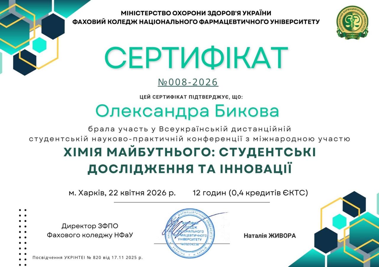 22 квітня 2026 року здобувачка освіти спеціальності G1 (161) Хімічні технології та інженерія Бикова Олександра взяла участь у Всеукраїнській дистанційній студентській науково-практичній конференції з міжнародною участю «Хімія майбутнього: студентські дослідження та інновації», яка була організована Фаховим коледжем НФаУ.